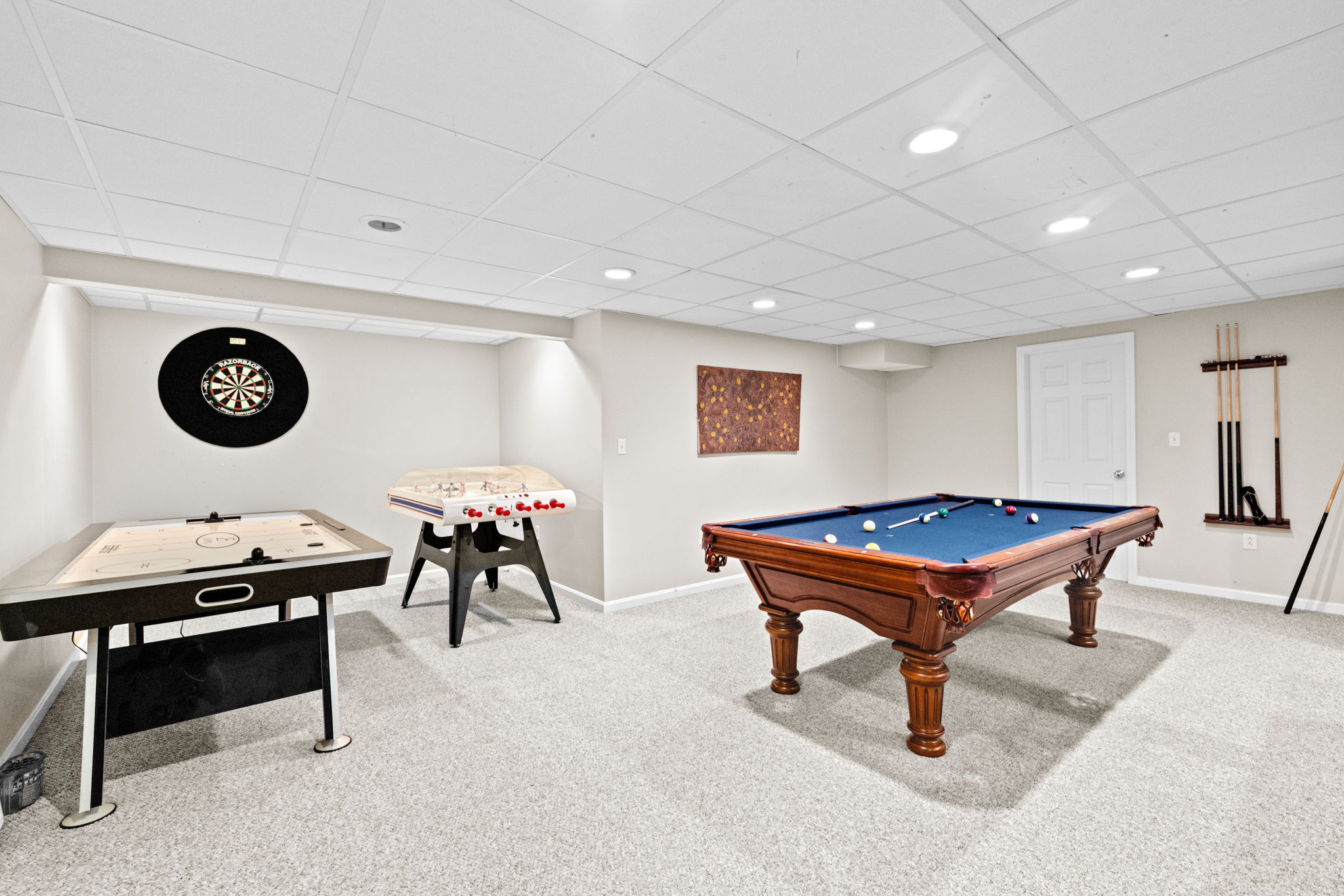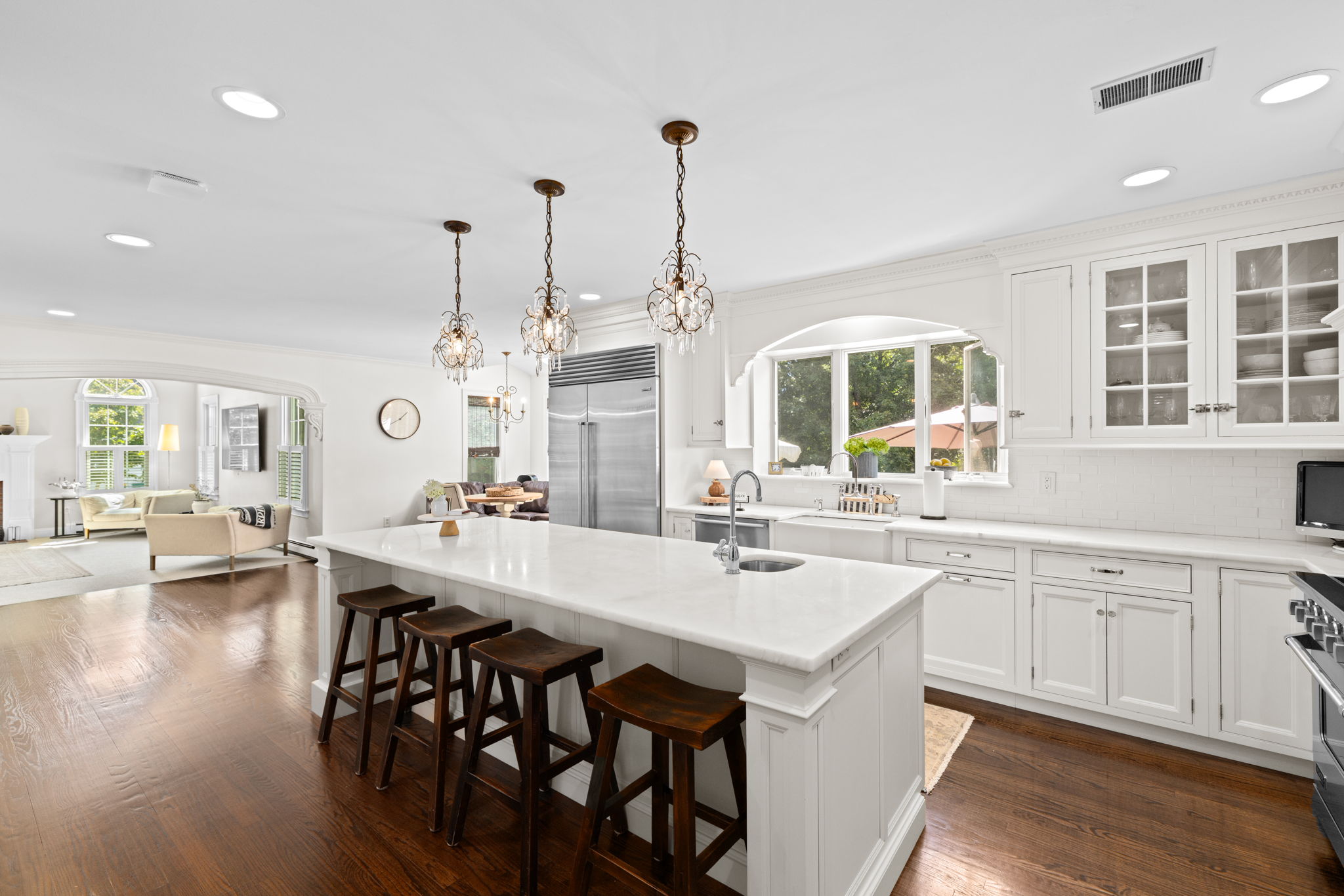 • Stunning kitchen features high-end appliances, marble counters, a large island, and breakfast nook.